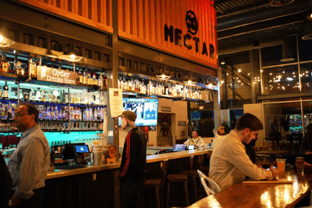 But the brewery and winery is only a fraction of the space’s use. In a choose-your-own-adventure style, people can enter the warehouse either through the right-side doors, where they’ll find Crooked Run’s taproom and Señor Ramon Taqueria, or through the left-side doors, where they’ll see cocktail bar Nectar and brunch spot Daybreaker, plus a stage ready for local bands. The two rooms are connected by a hallway allowing guests to meander and order from multiple spots in a food hall set-up. There is also an outdoor biergarten tricked out with fire pits and a back room for private events.