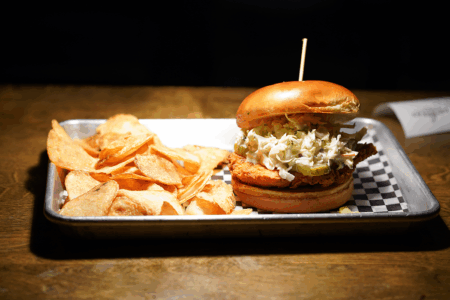 Rogan’s efforts and meticulous touches pay off. The overall vibe of the space evokes a neighborhood bar: locals and newcomers alike walking into a warm environment, greeted by welcoming staff, dark wood finishes and nostalgic indie rock music. Artwork created by one of the bartenders accompanies the names of beers on tap listed above the bar.