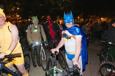 If you saw a minion, a fairy, a shark and Batman biking together Friday night, you were not hallucinating. Hundreds of cyclists from the DC Bike Party Facebook group assembled in Dupont Circle decked out in their best Halloween costumes that still provided mobility to pedal. The route took the bikers across the city, parading through Downtown, Penn Quarter and Capitol Hill, before winding up at La Cosecha in Union Market District for the afterparty. Photos by Shaughn Cooper.