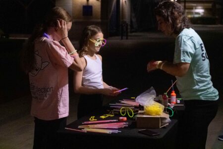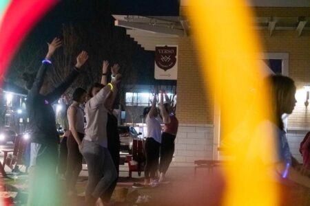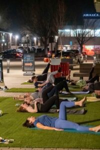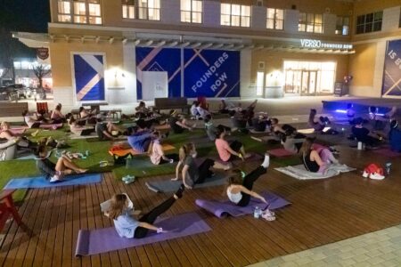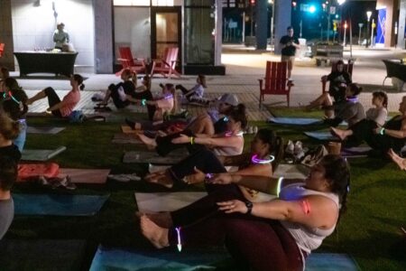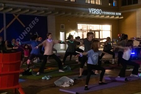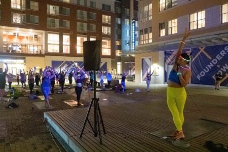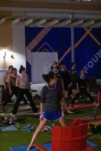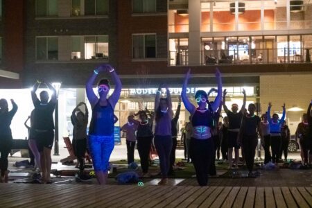 On March 23, DC Fray hosted an hour-long guided yoga session with a glow-in-the-dark twist at Founders Row in Falls Church, Virginia. Participants brought their own mats and upon arrival, they were offered glow sticks that could be fashioned into necklaces, bracelets and headpieces. Photos by Joe Jasper.