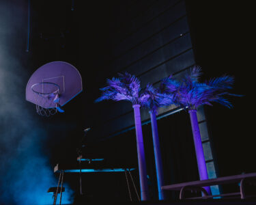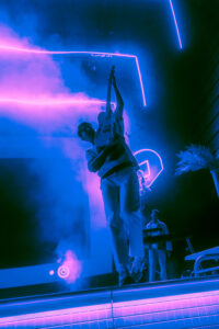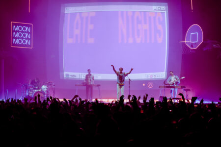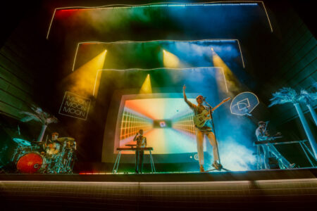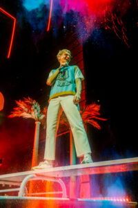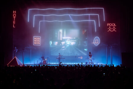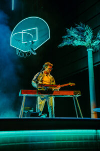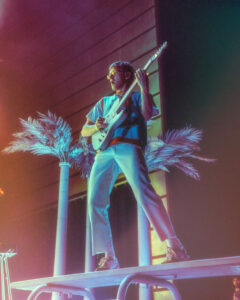 The group’s stage design puts the concertgoer in a California hotel with an invitation to an exclusive pool party. With palm trees, basketball hoops, and a diving board, the stage warmed up the D.C. cool weather vibe.