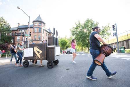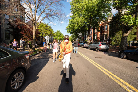 Healthcare workers are risking their lives everyday on the front lines of the fight against the coronavirus. To celebrate these heroes and all that they do for the community, the Aria Development Group funded and organized a Walking Concert with the musicians of 7DrumCity. Eight musicians walked 45 minutes from the 7DrumCity music space to the Children’s National Hospital, bringing along car packages to deliver during their finale performance outside of the hospital’s main entrance.